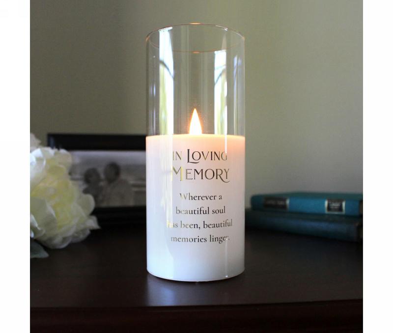 The flame is a reminder of the warm memories that are still burning. The consoling verse on the glass candle reads "In Loving Memory, Wherever a Beautiful Soul has Been, Beautiful Memories Linger" and is appropriate for either a man or a woman. The design is simple and will fit into any home decor. The LED candle features a warm, flickering, colored flame that is powered by 2 AA batteries. The glass vase with wax LED candle measures 7 inches tall and is 3 inches in diameter. The candle is the perfect size for a nightstand, an end table, a dresser, mantle, or even a desk. Batteries are not included.