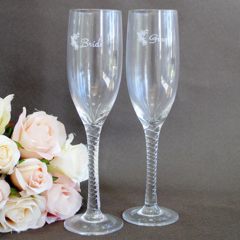 These wedding toasting glasses are etched with “Bride” and “Groom” and finished with an etched double wedding bell. The stem is a swirl design. Great if you don’t want to spend a fortune but would like some lovely glasses to toast your wedding.